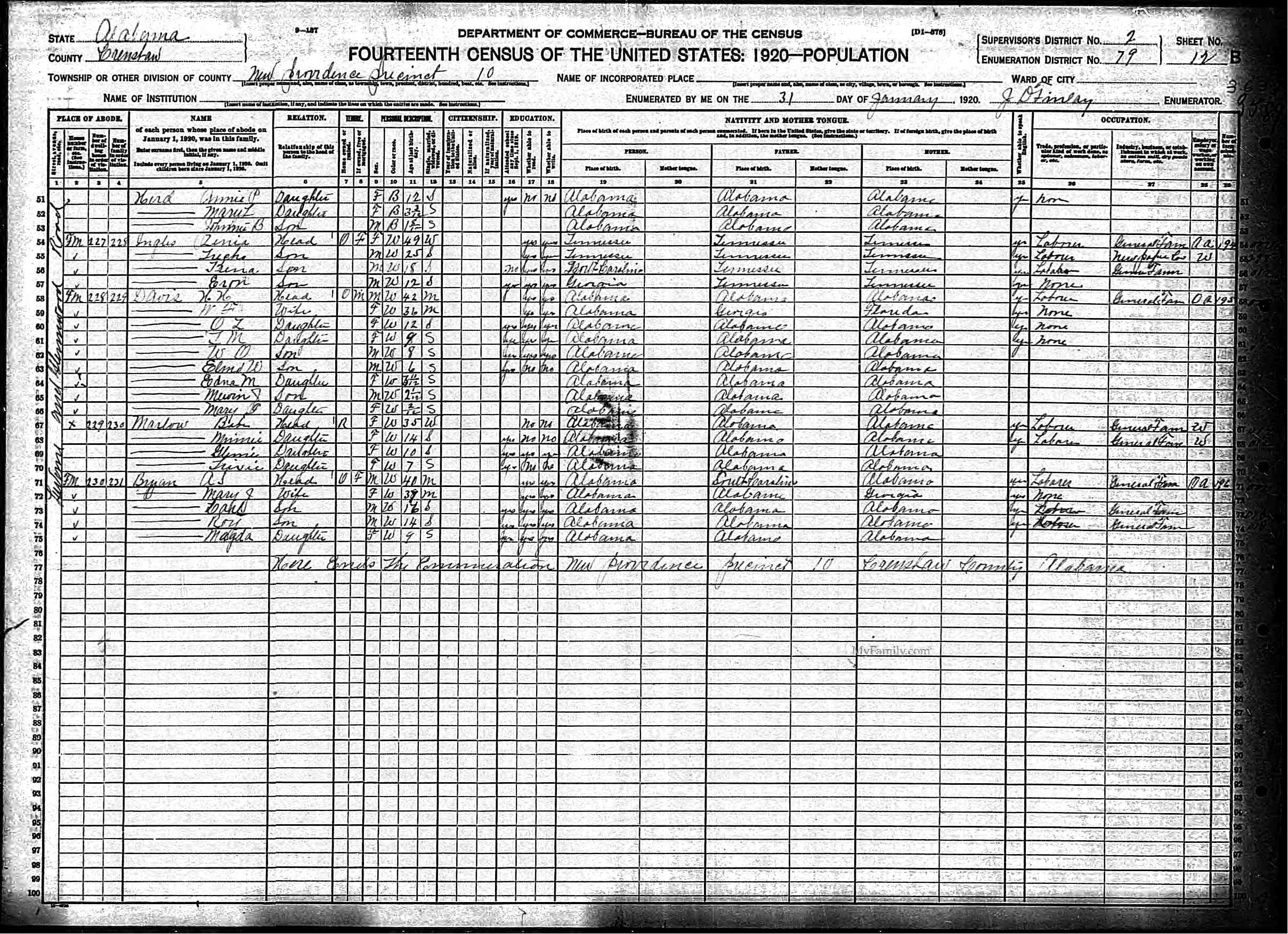 Source Citation: Year: 1920;Census Place: New Providence, Crenshaw, Alabama; Roll: T625_11; Page: 16B; Enumeration District: 79; Image: 368.