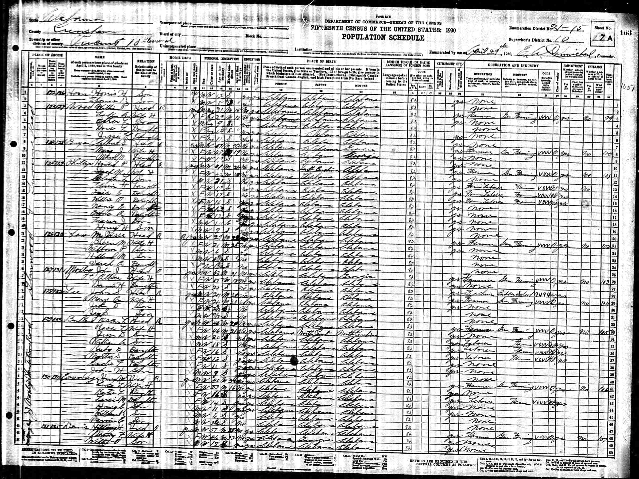 2. Census, 31 Jan 1920, New Providence Township, Crenshaw, Alabama, USA. 413 1920 United States Federal Census Name: H H Davis Home in 1920: New Providence, Crenshaw, Alabama Age: 42 years Estimated birth year: abt 1878 Birthplace: Alabama Relation to Head of House: Head Spouse's name: N F Father's Birth Place: Alabama Mother's Birth Place: Alabama Marital Status: Married Race: White Sex: Male Home owned: Own Able to read: Yes Able to Write: Yes Image: 368 Household Members: Name Age H H Davis 42 (Head) N F Davis 36 (Wife) O Z Davis 12 (Daughter) T M Davis 9 (Daughter) W O Davis 8 (Son) Elmo W Davis 6 (Son) Edna M Davis 3 11/12 (Daughter) Mervin J Davis 2 1/12 (Son) Mary O Davis 2/12 (Daughter)